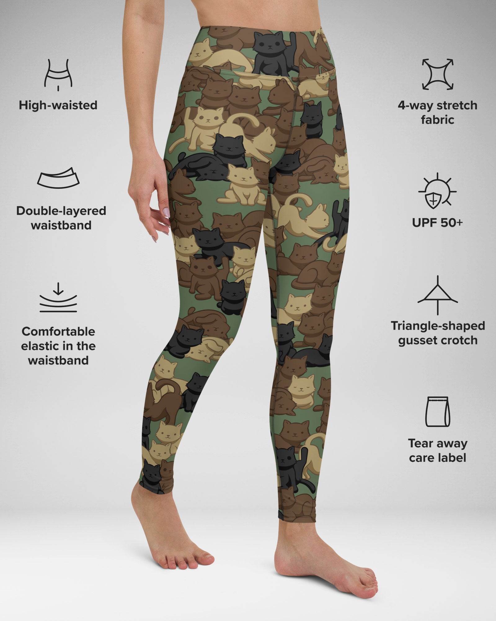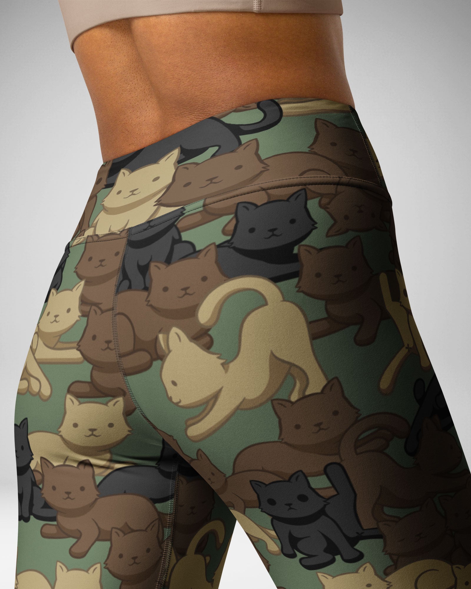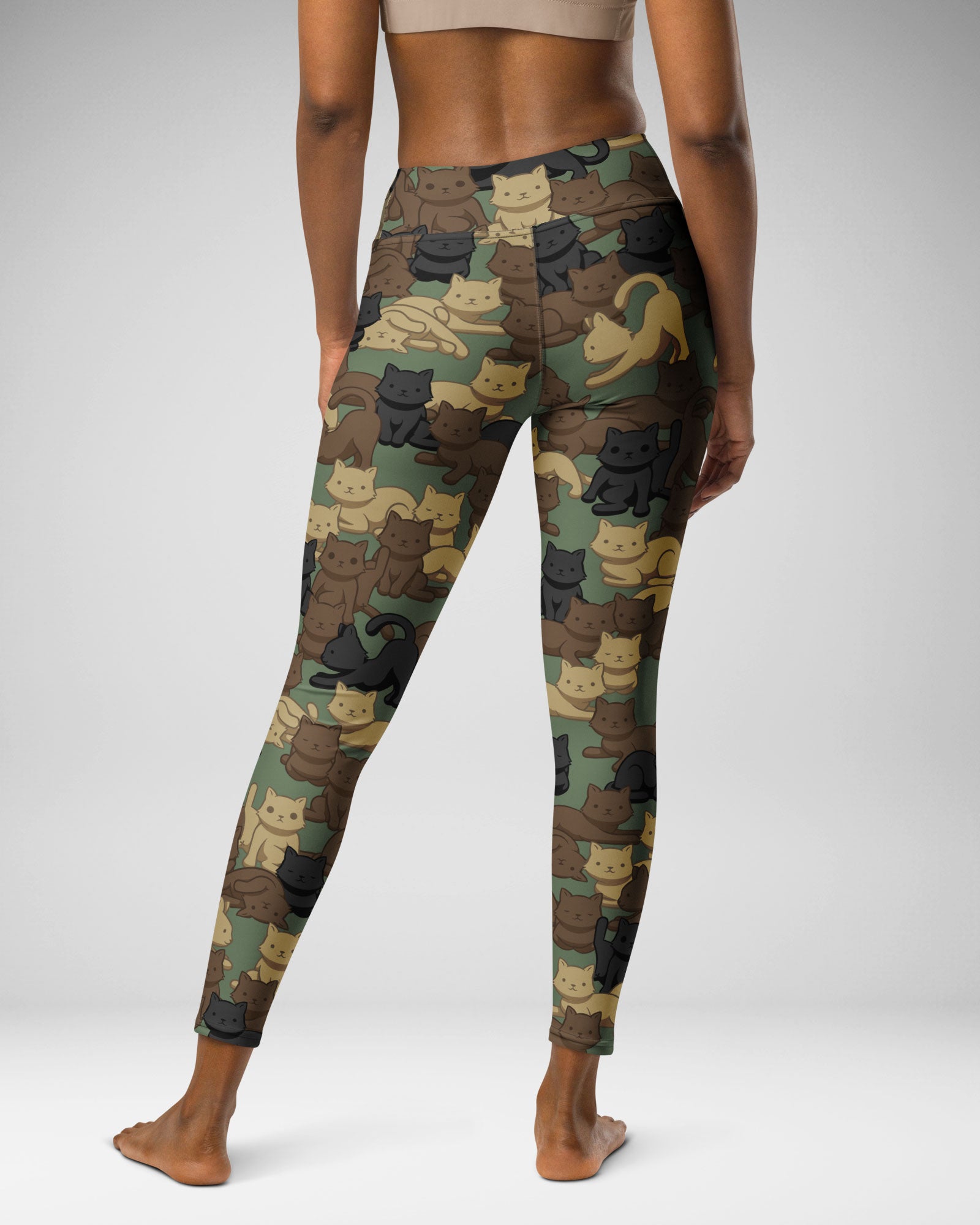 A playful twist on camouflage, these cat leggings blend woodland tones with cute feline details for a bold new take on camo leggings.