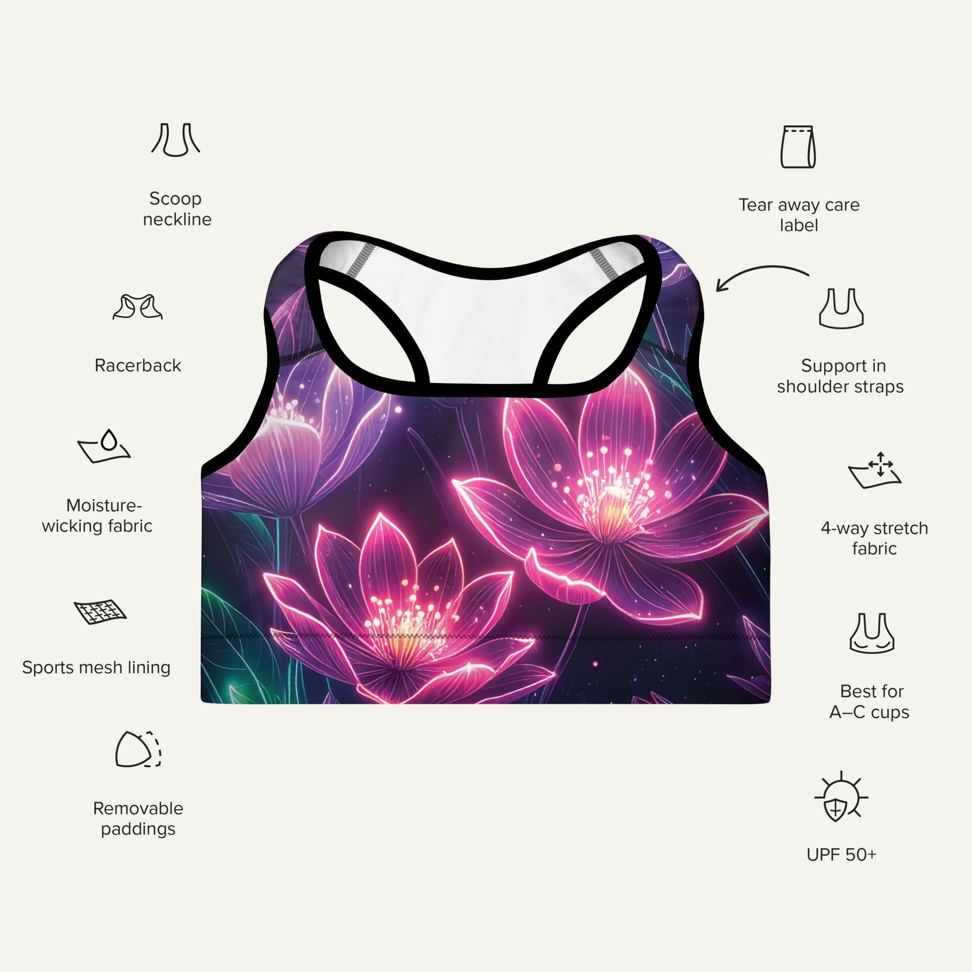 Stay comfortable and supported in this women’s padded sports bra—perfect for workouts, yoga, or everyday athleisure wear. With a fun, printed design and a flexible fit, they’re your new go-to workout gear for style and comfort.